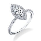 These marquise halo engagement rings showcase a distinctive marquise-shaped center diamond, known for its elongated form and pointed ends, gracefully surrounded by a halo of smaller diamonds. The halo of smaller diamonds surrounding the center stone enhances its brilliance, creating a mesmerizing play of light and adding a touch of timeless glamor to the ring. Sylvie’s marquise halo engagement rings are expertly crafted to showcase the utmost quality and craftsmanship. Each ring is designed with a perfect balance of traditional elegance and contemporary flair. Whether you choose a halo marquise engagement ring with a classic solitaire shank or opt for a marquise cut halo engagement ring with diamond-accented bands, Sylvie offers a range of options to suit your personal style.