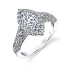 These marquise halo engagement rings showcase a distinctive marquise-shaped center diamond, known for its elongated form and pointed ends, gracefully surrounded by a halo of smaller diamonds. The halo of smaller diamonds surrounding the center stone enhances its brilliance, creating a mesmerizing play of light and adding a touch of timeless glamor to the ring. Sylvie’s marquise halo engagement rings are expertly crafted to showcase the utmost quality and craftsmanship. Each ring is designed with a perfect balance of traditional elegance and contemporary flair. Whether you choose a halo marquise engagement ring with a classic solitaire shank or opt for a marquise cut halo engagement ring with diamond-accented bands, Sylvie offers a range of options to suit your personal style.