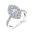These marquise halo engagement rings showcase a distinctive marquise-shaped center diamond, known for its elongated form and pointed ends, gracefully surrounded by a halo of smaller diamonds. The halo of smaller diamonds surrounding the center stone enhances its brilliance, creating a mesmerizing play of light and adding a touch of timeless glamor to the ring. Sylvie’s marquise halo engagement rings are expertly crafted to showcase the utmost quality and craftsmanship. Each ring is designed with a perfect balance of traditional elegance and contemporary flair. Whether you choose a halo marquise engagement ring with a classic solitaire shank or opt for a marquise cut halo engagement ring with diamond-accented bands, Sylvie offers a range of options to suit your personal style.