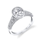 Oval modern vintage engagement rings draw inspiration from the intricate and romantic designs of the past. They are adorned with delicate filigree, milgrain detailing, and intricate metalwork. Many modern vintage oval engagement rings feature accent stones or halos to enhance the center oval diamond. Picture a circle of smaller diamonds or gemstones gracefully encircling the oval diamond at the center. The oval-shaped diamond, with its elongated silhouette and rounded ends, not only dazzles with its brilliant sparkle but it elongates your finger, adds a touch of sophistication, and ensures that your ring stands out from the rest. These engagement rings can be crafted in various metal options, including platinum, white gold, yellow gold, and rose gold. Each metal enhances the ring’s character and complements your style, making it uniquely yours.