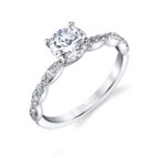 This stunning and unique stackable engagement ring, Vida, features a 1 carat round brilliant diamond center setting and 0.12 carats of diamonds alternating in pear and round shapes for a delicate and feminine look. For a more geometric setting, the Darcy features 0.12 carats of round brilliant diamonds set in alternating small and large diamond shapes. The Ivanna is another standout engagement ring choice. This delicate engagement ring features a 1 carat round brilliant center diamond setting accompanied by 0.38 carats of additional round diamonds flowing down both sides in a single prong setting.