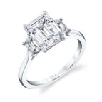 These emerald three stone engagement rings feature a center emerald-cut diamond flanked by two smaller diamond side stones. This setting is often used to symbolize the past, present, and future of a couple’s journey together. The emerald-cut center stones, known for their rectangular shape and step-cut facets, showcase exceptional clarity and provide a distinctive look. With their clean lines and geometric appeal, emerald three stone engagement rings pair beautifully with round, oval, emerald, princess, and baguette side stones. The combination of the emerald-cut diamonds and the symbolism behind the three stone setting creates a meaningful and sentimental piece of jewelry.