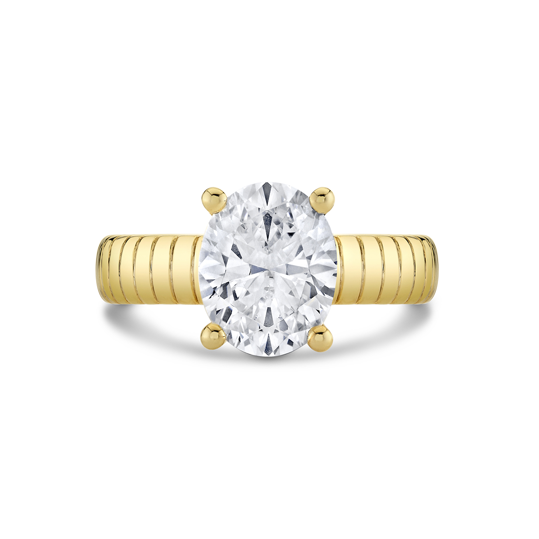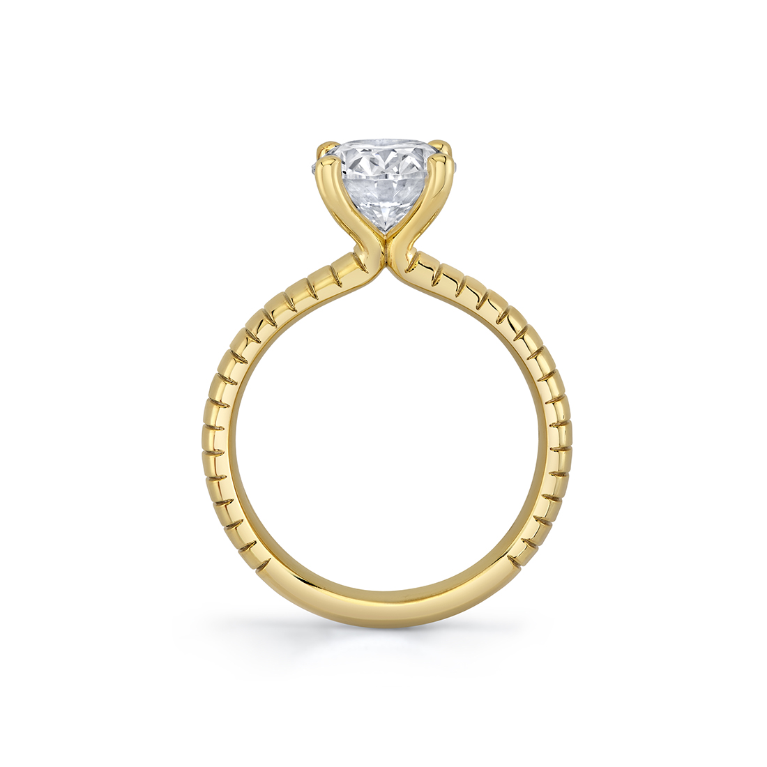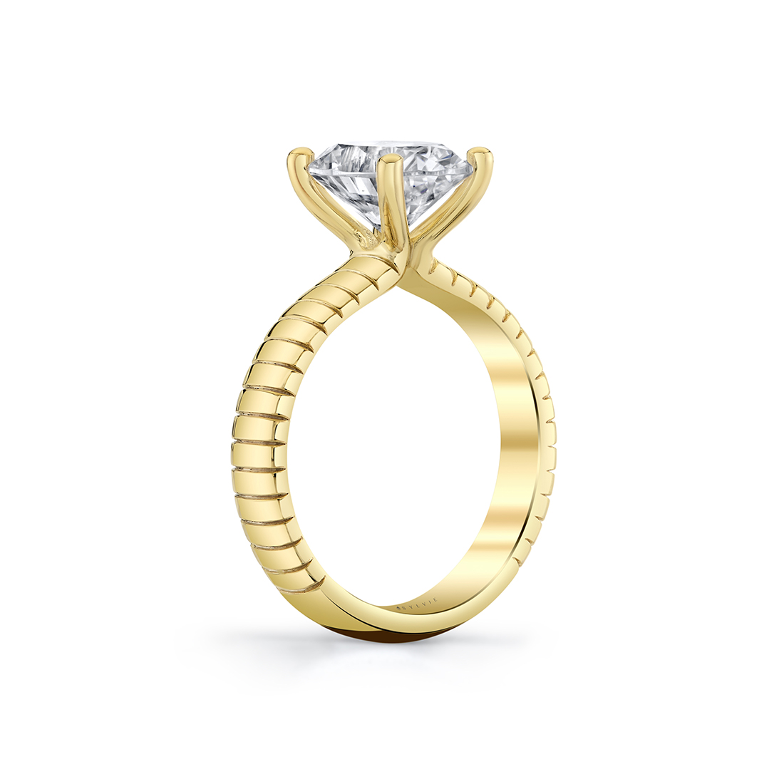 This sculptural Auravie engraved solitaire engagement ring setting features engraved vertical lines that wrap around the band in a rhythmic, dimensional pattern.