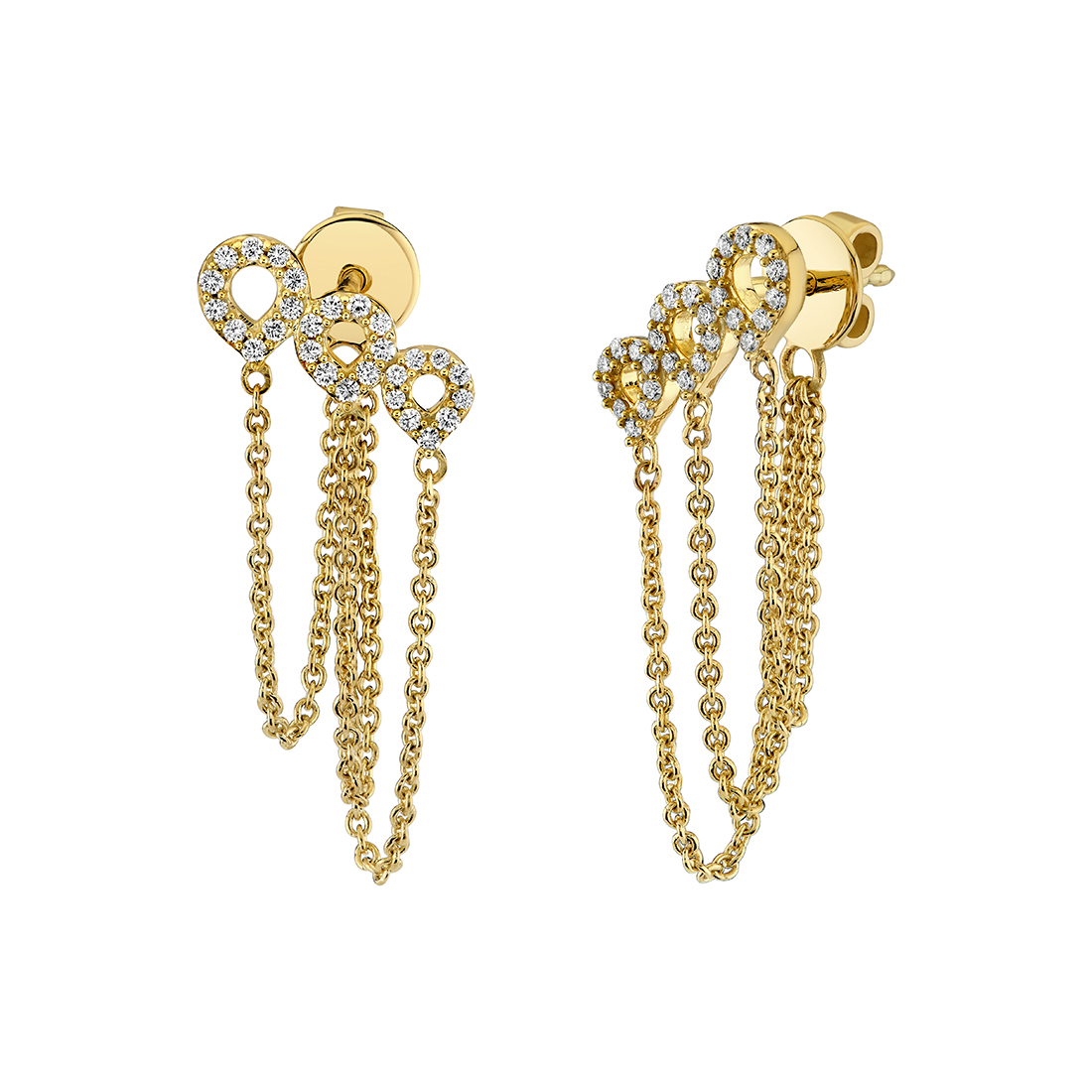 Three pavé Shells, totaling 0.25 carats, anchor cascading chains for refined movement and a lightweight feel. Crafted in 14K or 18K gold, these chain earrings feature a sleek profile making them an easy choice for everyday wear.