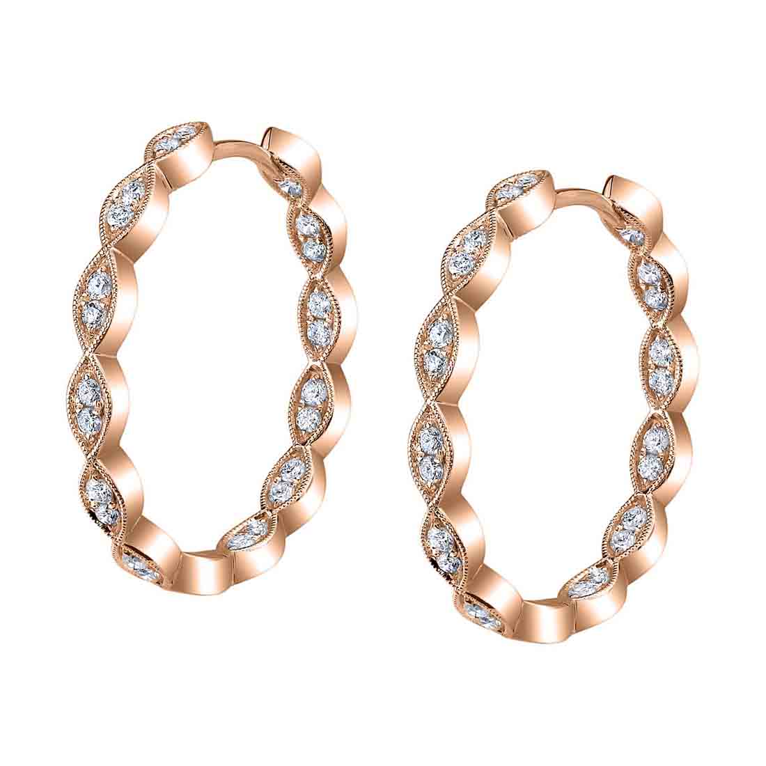 These beautiful vintage inspired diamond hoop earrings include 0.53 carats of shimming round diamonds nestled in marquise shaped designs with milgrain beaded edging. Perfect for a vintage style wedding or every day wear, these earrings are available in 14k or 18k, white, rose or yellow gold as well as platinum.