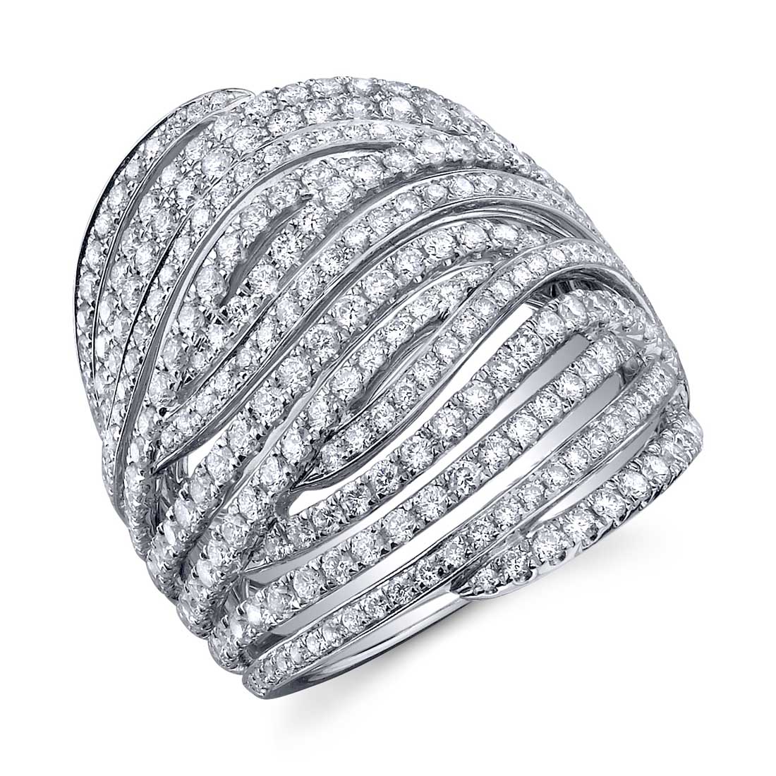 This designer diamond ring features fourteen ribbons of round pave diamonds nestled in channel settings. Each ribbon appears to weave around and under each other in a flowing pattern. This fashion ring is 2.30 carats.