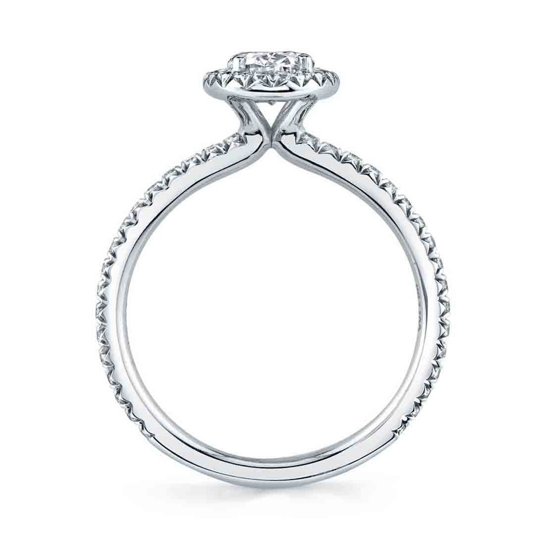 This gorgeous oval engagement ring includes a 1 carat, oval-cut diamond with a single halo of sparkling diamonds. The band features a train down both sides of shimmering, round-cut diamonds, making the setting's total weight come to 0.32 carats.