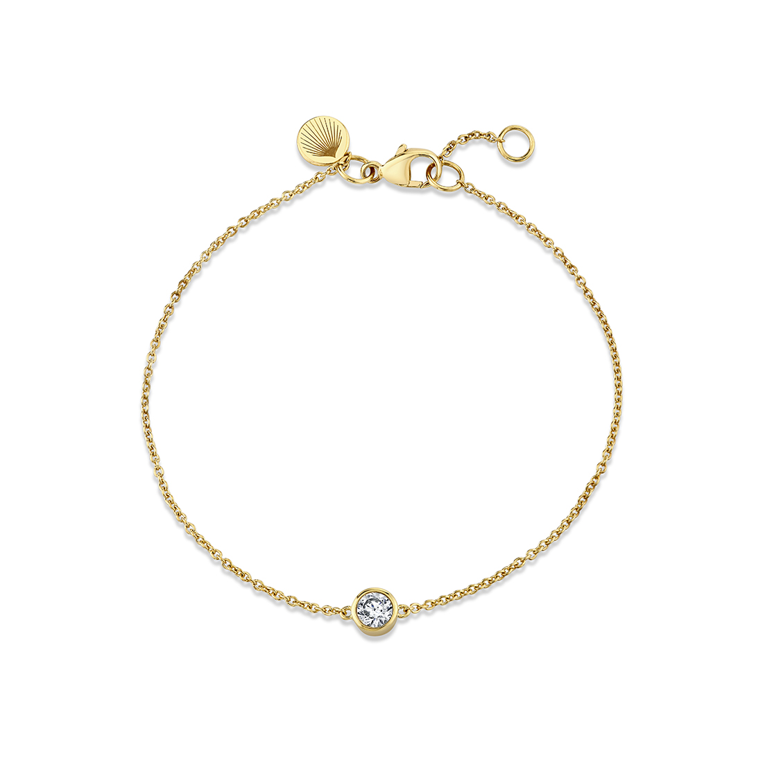 A single bezel-set round diamond, totaling 0.23 carats, sits at the center of your choice of a 14K or 18K gold chain for a clean, minimal look. This lightweight round bezel diamond bracelet is perfect for everyday wear.