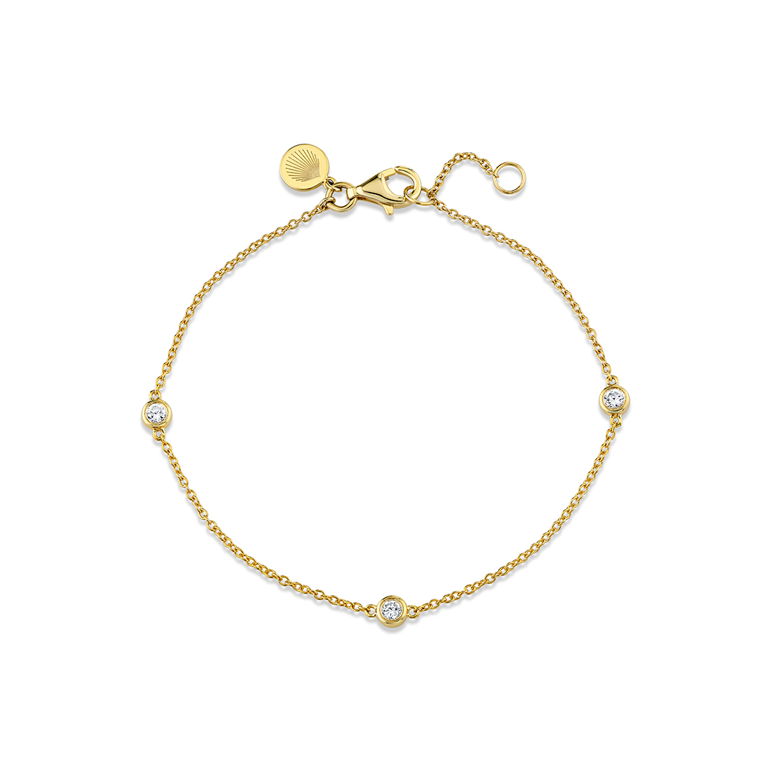 A trio of petite round diamond bezels, totaling 0.2 carats, are evenly spaced along a delicate 14K or 18K gold chain for a light, refined station look. This round bezel diamond trio bracelet is comfortable, adjustable, and easy to layer.