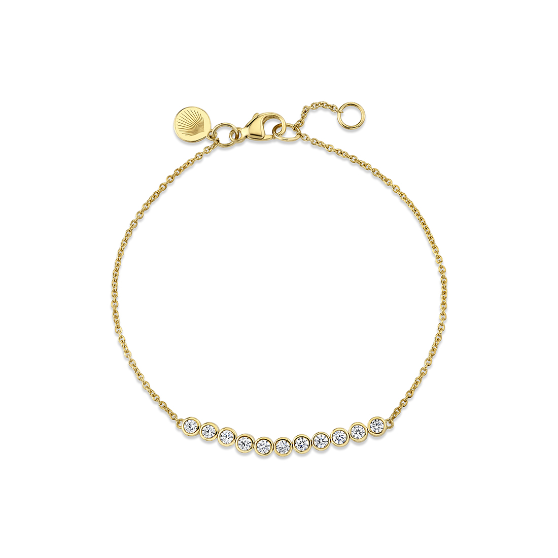 Petite round diamond bezels, totaling 0.5 carats, sit close together, creating a flexible bar of diamonds that sits at the center of a delicate gold chain. This round bezel diamonds bracelet catches light while keeping a slim, comfortably classic look.
