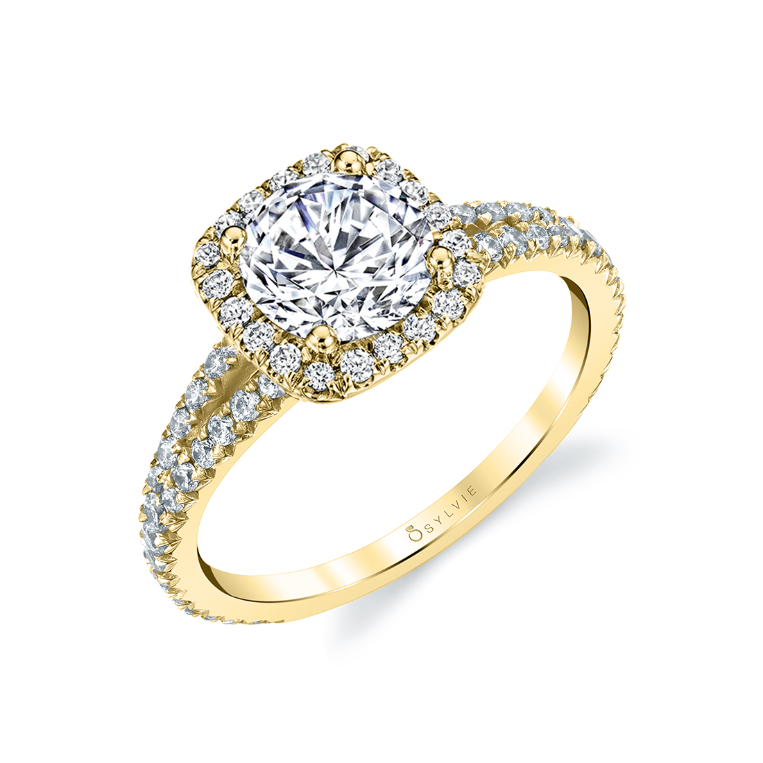 Round Cut Cushion Halo Split Shank Engagement Ring