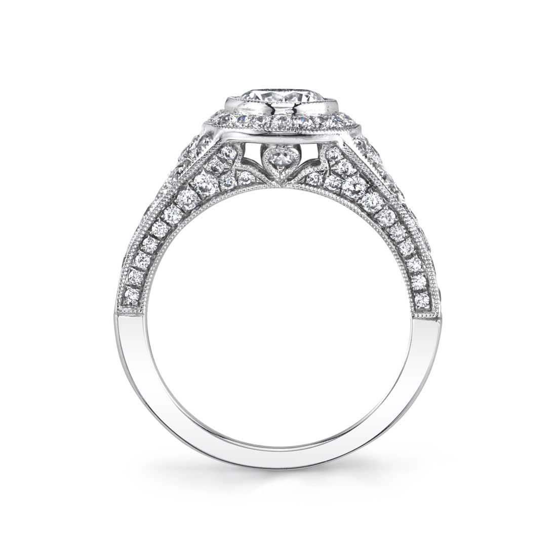 This impressive round cut modern vintage bezel engagement ring features a dazzling 1 carat round brilliant diamond center in a milgrain framed bezel setting. An intricate halo of pave diamonds accentuates the center stone and the tapered shank continues the vintage motif with additional diamonds of various sizes down the shank and along both sides. This milgrained accented engagement ring contains a total weight of .80 carats.