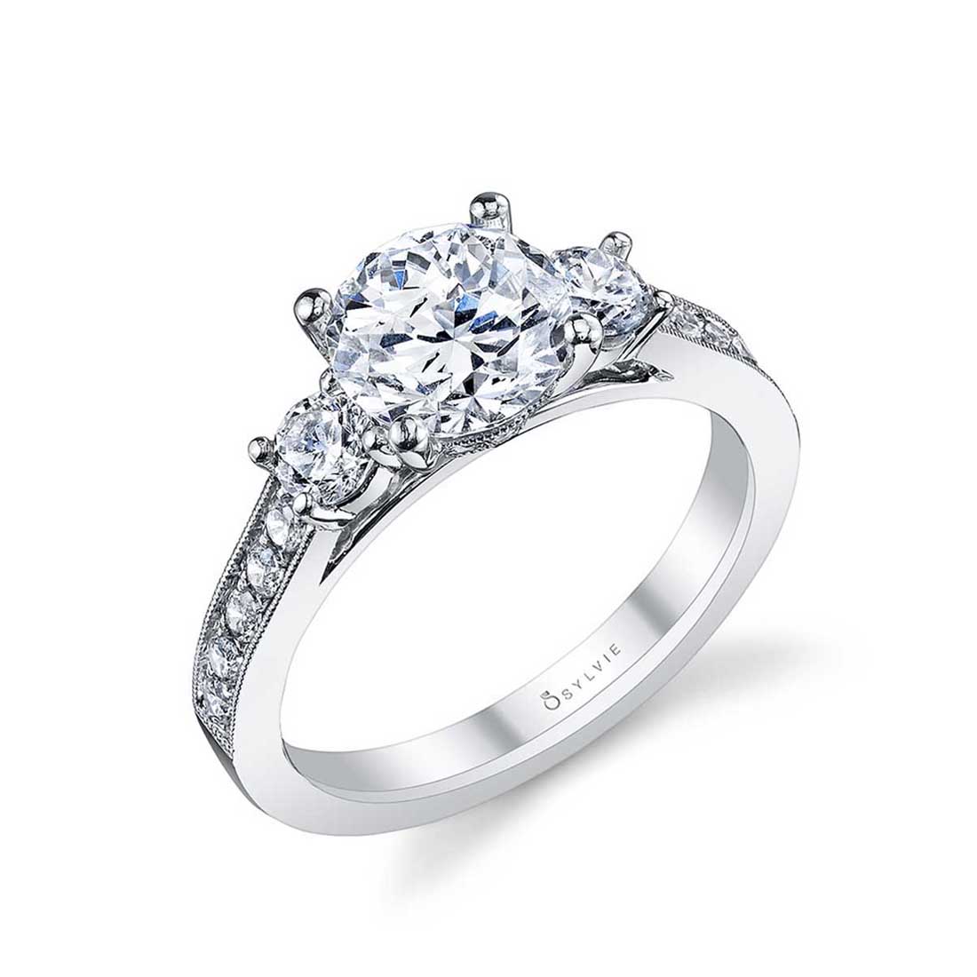 This classic three stone engagement ring features a sparkling 1.5 carat round center with smaller round diamonds on each side, all suspended above a beautifully designed shank adorned with more shimmering diamonds nestled in milgrain edged channels flowing half way down. The total weight of this impressive three stone ring is 0.57 carats. *Price does not include center stone.