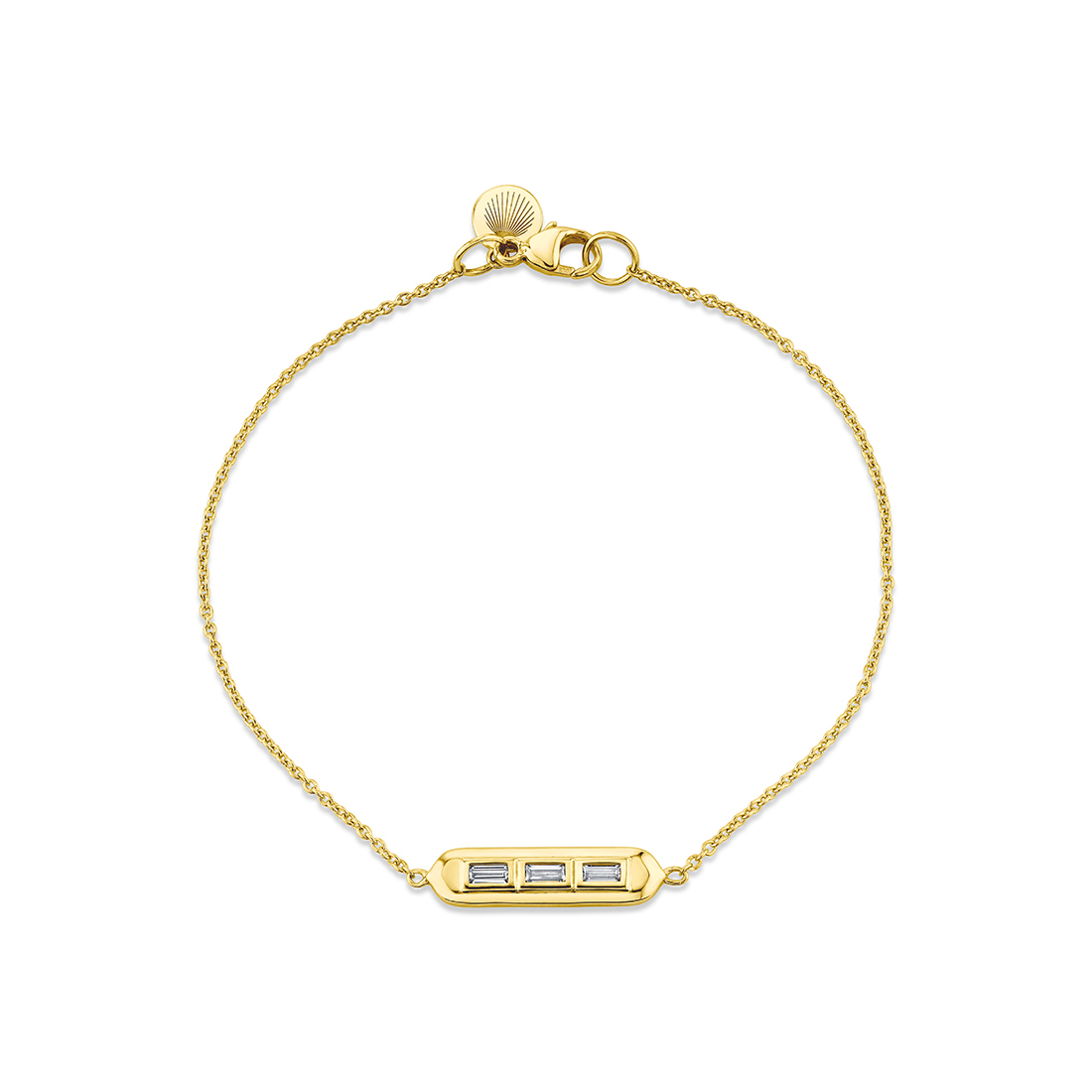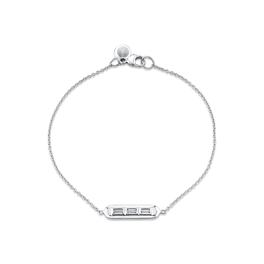 A slim bar with three east-west baguette diamonds, totaling 0.18 carats, capped by Shell tips sits at the center of a 14K or 18K fine chain creating a bezel baguette diamond bracelet that looks minimal, geometric, and is easy to stack.