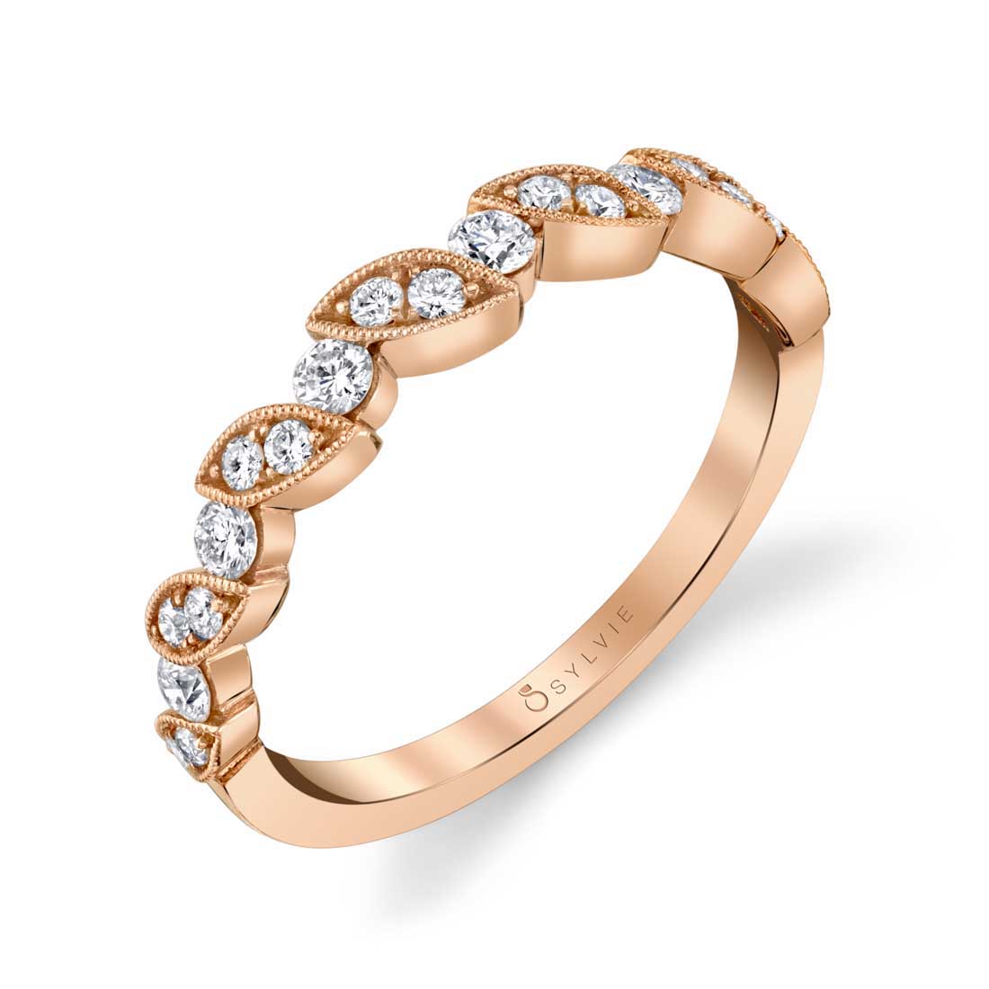 Designed with alternating round and marquise shapes and framed with milgrain beaded edging, this dazzling rose gold stackable diamond band features a total weight of 0.35 carats. Stack this enticing wedding band with other favorite Sylvie bands for a unique and trendy mixed metal look!