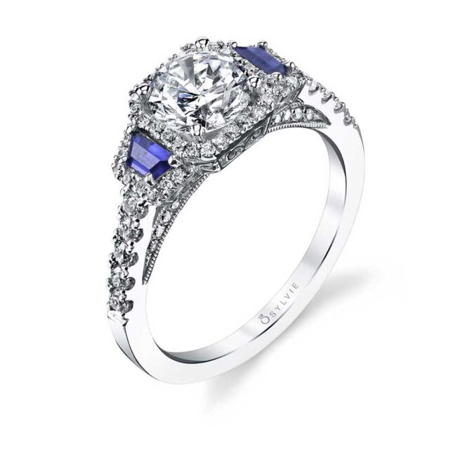 Three Stone Engagement Ring with Sapphires and Baguettes